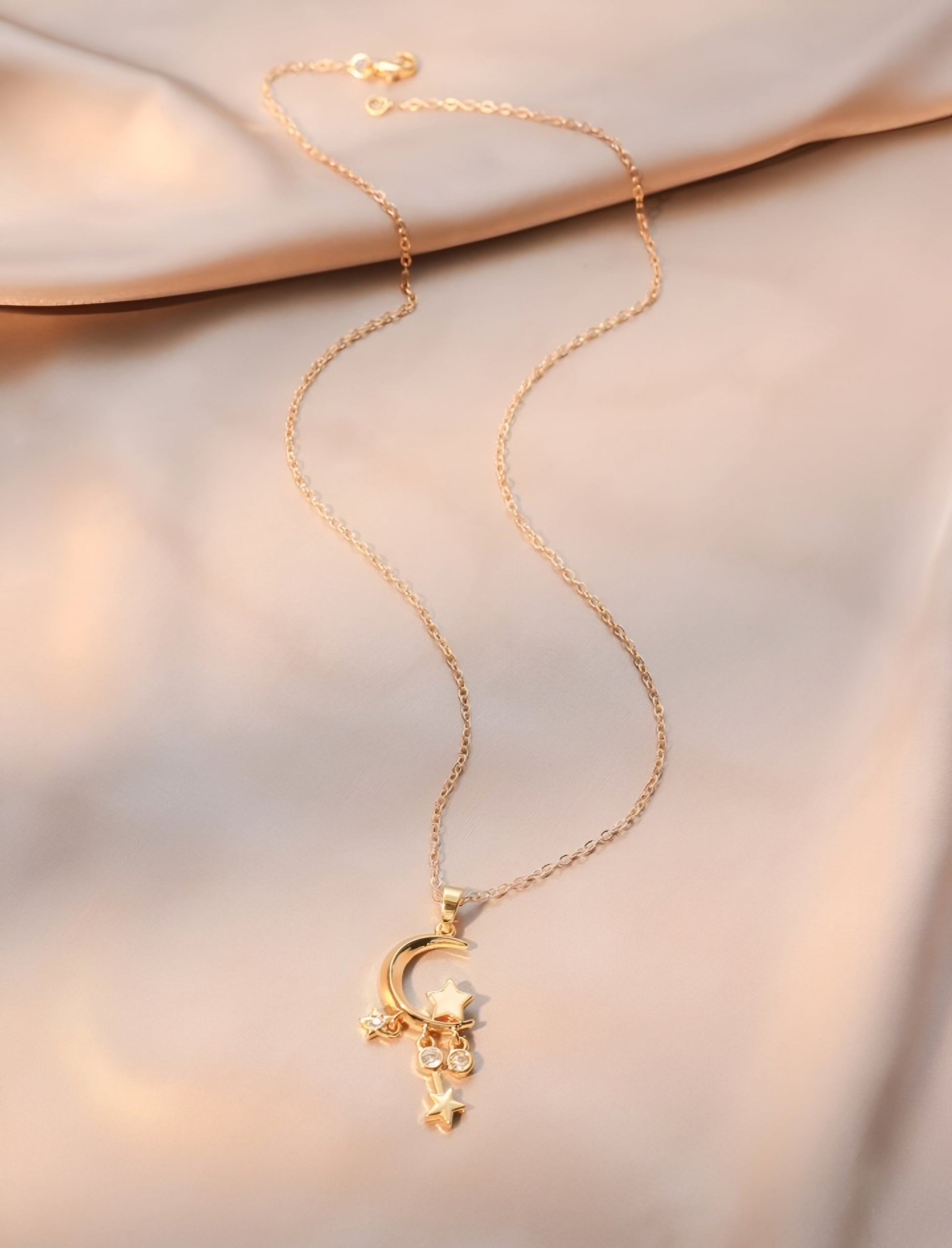 This stainless steel necklace features a delicate moon and star pendant, available in elegant gold and silver tones. Crafted for durability and lasting shine, it offers a refined accessory that complements both casual and formal attire. Its timeless celestial design adds a subtle yet sophisticated touch to any outfit.